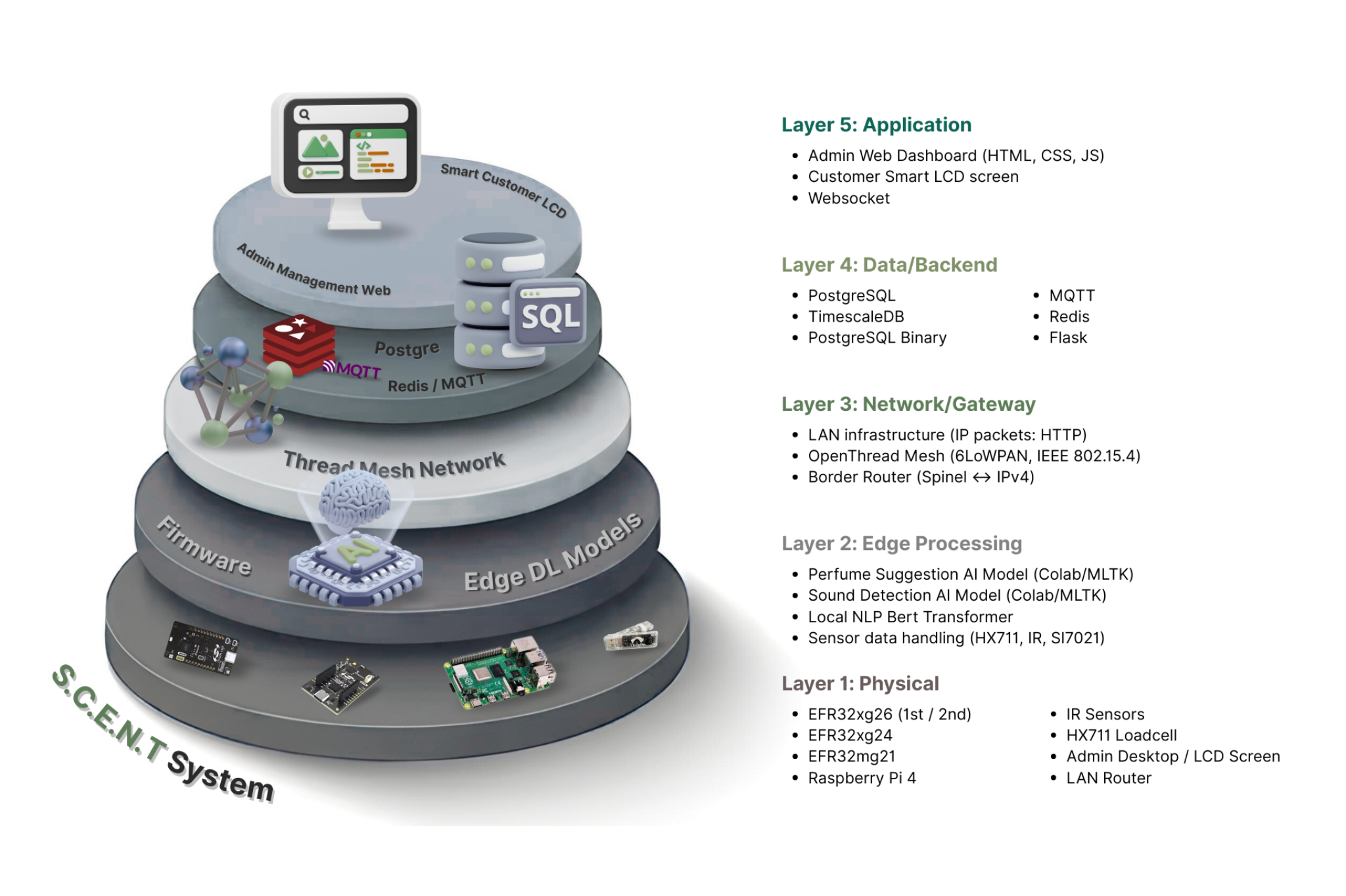 SCENT is an offline-capable AIoT system for retail: personalized scent suggestions, inventory sensing, and environmental threat detection. Designed for continuous operation with local buffering & sync, and on-device/edge inference for low-latency experience.